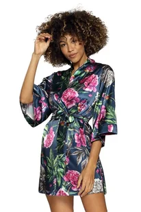 Satynowy szlafrok w delikatny wzór w duże różowe kwiaty na ciemnoniebieskim tle o długości około 90 cm. Satynowy szlafrok posiada rękaw 3/4, szerszy krój. W talii zawiązywana jest na pasek wsuwany w boczne szlufki. Zapakowany w ozdobne pudełko.