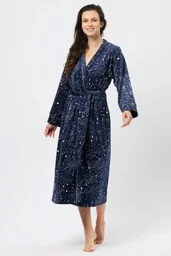 Cechy produktu: materiał Velvet Fleece* lekki, elastyczny, jedwabisty, klasyczny, swobodny krój sięgający do połowy łydki, boczne kieszenie i szalowy kołnierz, wzór rozgwieżdżonego nieba z motywem kobiecej sylwetki i łabędzia, dwa modele paska: materiałowy i satynowy, * Velvet Fleece to wyjątkowo miękki i ciepły materiał, łączący luksus aksamitnej powierzchni z wygodą i izolacją polaru. Idealny do odzieży domowej i zimowych ubrań, zapewnia komfort oraz elegancki wygląd. Skład : 95% polester, 5% elastan *kolor może nieznacznie różnić się w zależności od ustawień monitora
