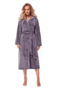 Szlafrok damski posiada na boku srebrny haft z motywem kwiatowym. Szlafrok wykonany jest w 100% z poliestru, posiada grube włosie po obu stronach oraz elementy dekoracyjne. Posiada kaptur i praktyczne kieszenie. Szlafrok jest owinięty i posiada pasek. Długość w rozmiarze M: