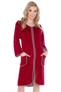 Welurowy szlafrok na zamek w kolorze głębokiej czerwieni z biało-czerwonymi paskowanymi brzegami. Szlafrok jest uszyty z weluru który jest typem aksamitu z krótkim włosem, strona wewnętrzna jest uszyta z miękkiej bawełny. Szlafrok jest wyposażony w dwie kieszenie i pętle na zawieszenie. Nie ma kaptura . Całkowita długość szlafroku mierzona od ramiennego szwu jest ok 100cm .