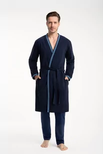 Granatowy szlafrok męski polskiej marki Luna z bawełnianej dzianiny dresowej, z niebieską plisą to klasyczny model, który można zestawiać z wieloma piżamami męskimi z naszej kolekcji. Na całej długości szlafroka znajduje się niebieska plisa, która urozmaica całość i dodaje klasy. Szlafrok zawiązywany jest na wygodny pasek i posiada praktyczne kieszenie. Długość szlafroka około kolan. Całość prezentuje się klasycznie i stylowo.
