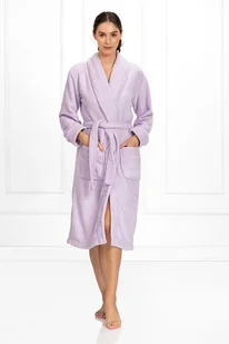 Mięciutki szlafrok w jasnofioletowym kolorze jest wiązany paskiem Szlafrok jest wyprodukowany z 100% poliestru. Jest miękki i miły w dotyku. Ma długie rękawy i szalowy kołnierz. Wiąże się paskiem. Ma kieszenie.