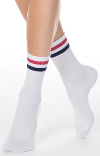 Bawełniane skarpetki damskie białe Active. Skarpetki w jasne lureksowe paski wyglądają tak stylowo i oryginalnie, że nie będziesz chciała ich chować pod ubraniem. Nie krępuj się nosić modnych skarpetek w sportowym stylu, podkreśl swoją indywidualność.