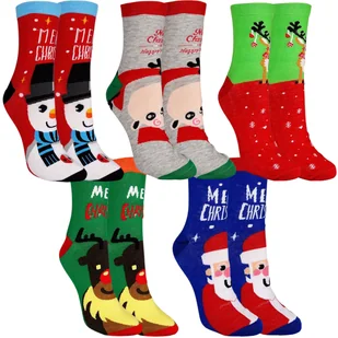 Świąteczne skarpetki damskie z motywami przedstawiającym pingwiny, renifery, mikołaje, bałwany i misie. Skarpety są wysokie, zakończone ściągaczem oraz dodat...
