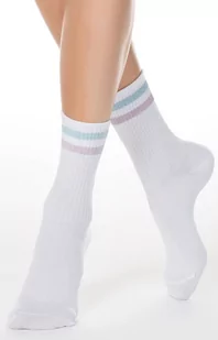 Skarpetki damskie białe z paskami Active. Bawełniane skarpetki w jasne lureksowe paski wyglądają tak stylowo i oryginalnie, że nie będziesz chciała ich chować pod ubraniem. Nie krępuj się nosić modnych skarpetek w sportowym stylu, podkreśl swoją indywidualność.