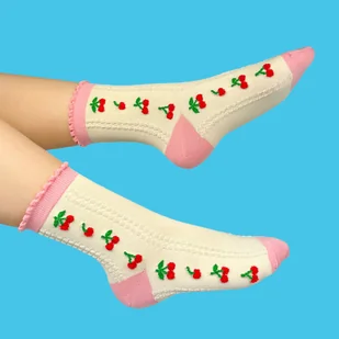 Skarpetki damskie z wiśniami i różową falbanką - beżowe skarpetki w owoce