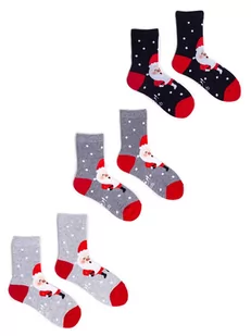 Świąteczny wzór Miłe i elastyczne Nieuciskający ściągacz 3-pak – ekonomiczne i wygodne rozwiązanie Dziecięce skarpety świąteczne w praktycznym trzypaku. W trzech kolorach: jasnoszarym, ciemnoszarym i granatowym, z motywem Mikołaja. Skarpety są miłe w dotyku, dobrze układają się na stopie. Uszyte z miękkiego i zarazem wytrzymałego materiału, który gwarantuje duży komfort noszenia.