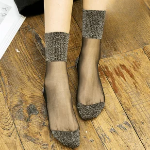 TEMU 2 pary eleganckich, przezroczystych skarpetek do połowy łydki dla kobiet - oddychające czarne pończochy z złotymi i srebrnymi paskami, 200g/㎡