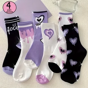 TEMU 4/10 Par Skarpetek Damskich do Połowy Łydki - Oddychające i Wygodne, Wzór z Serduszkami i Geometrycznymi Motywami, Różne Kolory (Fioletowy,