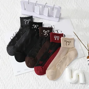 TEMU 5 par nowych, oddychających, krótkich skarpetek w letnim stylu z koronką i uroczą kokardką, idealne do stworzenia słodkiego wyglądu