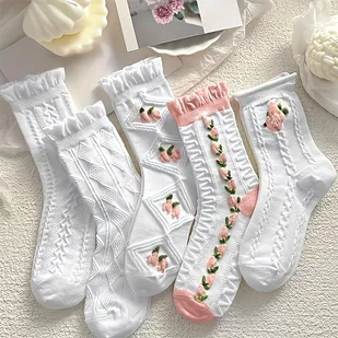 TEMU 5 par uroczych różowych skarpet damskich do połowy łydki z falbankami w kwiatowy wzór