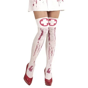 Zakolanówki białe Ozdobione czerwoną farbą imitującą plamy z krwi. Posiadają czerwone koło z białym krzyżykiem, symbol pielęgniarki na końcówkach. Grubość: 7...