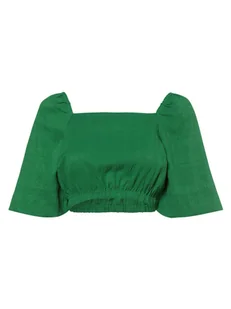 Kobieca krótka bluzka marki Aygill's z marszczonego materiału ze stretchem stanowi podstawę modnych stylizacji w stylu ulicznym.