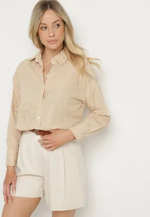 Beżowa Bawełniana Koszula z Lnem Zdobiona Haftem Terkio