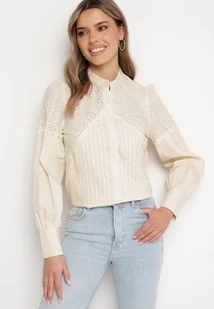 Beżowa Bawełniana Koszula ze Stójką i Ażurową Koronką Lathorissa