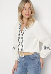 Beżowa Koszula z Wiskozą z Dekoltem w Serek i Kwiatowym Haftem Gonnavia