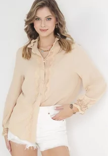 Beżowa Koszula ze Stójką i Koronkowymi Zdobieniami Kalla