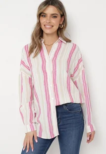 Beżowo-Fuksjowa Bawełniana Koszula w Paski o Luźnym Kroju Lievan