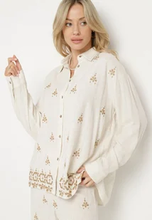 Biało-Beżowa Koszula z Lnu i Wiskozy Ozdobiona Haftem w Stylu Etno Alarisa