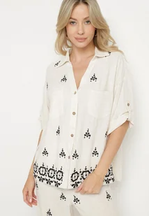Biało-Czarna Koszula Overisze z Wiskozy i Lnu z Wzorem Etno Jaslena