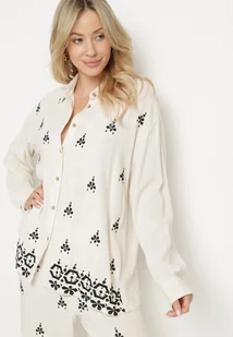 Biało-Czarna Koszula z Lnu i Wiskozy Ozdobiona Haftem w Stylu Etno Alarisa