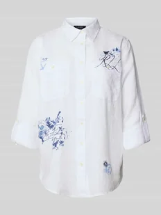 Bluzka koszulowa damska Lauren Ralph Lauren;Czysty len;Luźny krój;Model ‘RIMNAN’;Kołnierzyk koszulowy;Listwa guzikowa;Rękaw 3/4;Kieszeń na piersi;Długość tyłu w rozmiarze S: 72 cm