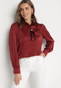 Bordowa Koszula z Bufiastymi Rękawami Ozdobnym Kołnierzykiem i Broszką Gonadria
