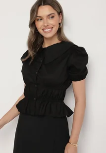 Czarna Bawełniana Koszula z Bufiastymi Rękawami i Ozdobnymi Marszczeniami Efrinda