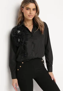 Czarna Koszula Ozdobiona Falbankami Kwiatami i Perłami Miralith