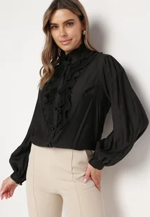 Czarna Koszula w Stylu Vintage Ozdobiona Falbankami z Perełkami z Przodu Calipso