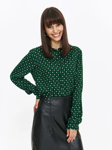 Koszula damska dostępna w kolorze ciemnej zieleni TSKS25BLK356299X00. Modelka ma 177 cm wzrostu i prezentuje rozmiar 34.
