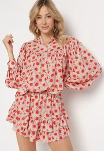 Beżowo-Czerwona Koszula ze Stójką z Długim Rękawem Zapinana na Guziki Kannesha