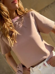 T-shirt z dzianej bawełny. Wyróżniają go; fantazyjne połączenie koloru bazowego nude ze ściągaczem w pastelowym różu, najwyższa jakość polskiej produkcji bawełny, mięsisty i gruby splot - 260g/m2, a także absolutn ...