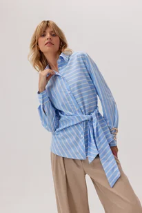 Elegancka koszula damska w paski o lekko dopasowanym kroju, uszyta z wysokiej jakości popeliny z dodatkiem elastanu. Materiał ten zapewnia nie tylko elegancki wygląd, ale także wysoki komfort noszenia i swobodę ruchów. Fantazyjne wiązanie z boku w talii podkreśla sylwetkę i tworzy efektowne fałdy z przodu, nadając koszuli unikalny charakter. Idealna zarówno do biura, jak i na mniej formalne okazje. Klasyczny kołnierzyk na stójce