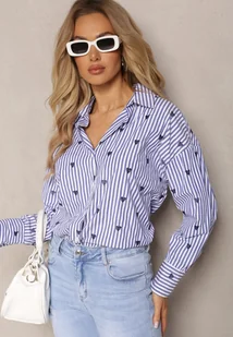 Granatowa Koszula Bawełniana w Paski z Haftowanymi Serduszkami Sanileni