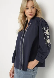 Granatowa Koszula z Bawełny Zdobiona Haftem i Delikatną Falbanką onamira
