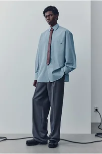 Koszula z miękkiej bawełnianej tkaniny pochodzącej od włoskiego producenta Cangioli 1859. Luźny fason. Wykładany kołnierzyk, gładka listwa z zapięciem, na piersi kieszeń z małym haftem. Z tyłu karczek z kontrafałdą i pętelką. Długie rękawy z rozcięciem i guzikiem zabezpieczającym oraz regulowanym mankietem.