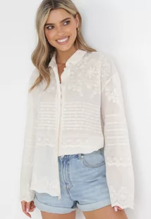Jasnobeżowa Bawełniana Koszula Zdobiona Haftem w Kwiaty Azyia