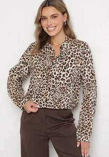 Jasnobeżowa Klasyczna Koszula z Wiskozą w Panterkę z Podpinanymi Rękawami Eleffia