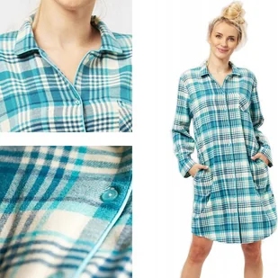 Flanelowa koszula nocna marki KEY rozpinana z przodu. Klasyczna długość przed kolano. Dyskretne i bardzo praktyczne kieszenie po bokach. Chroni i otula ciepłem uda i pośladki, w dole wykończona łukiem - pozwala na pełną swobodę ruchu i wygodę. Dzięki guzikom na całej długości można nosić ją także jako całodzienną ciepłą narzutkę. Urocza, ozdobna kieszonka na piersi. Delikatna i cudownie przyjemna w dotyku tkanina flanelowa ogrzewa ciało w chłodne noce i poranki. Włókna w 100% bawełniane wysokiej jakości w połączeniu z odpowiednim ściegiem i nićmi dają trwałe i długie użytkowanie. Rozświetlające połączenie ciepłego beżu i turkusu jest bardzo kobiece i harmonijnie tworzy przestrzenną kompozycję. Całość miękka, dająca swobodę ciału, zapewnia spokojny, komfortowy sen.