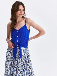 Bluzka damska Top Secret z efektownym wiązaniem u dołu. Ujmująca komfortem podczas użytkowania bluzka damska w wersji bez rękawów na cienkich regulowanych ramiączkach z delikatnie odsłoniętą górną częścią pleców. Posiada ona dekolt w serek oraz duże ozdobne guziki do zapinania na całej długości przodu, a u jej dołu pośrodku przodu umiejscowiono wiązanie z wykorzystaniem dłuższych części materiału. Wykonana ona została z gładkiej oraz przyjemnej w dotyku dzianiny wiskozowej, sprawdzając się zarówno w stylizacjach z długą spódnicą, jak i również z krótkimi szortami. Bluzka dostępna w kolorze niebieskim SKE0063NI. Modelka ma 177 cm wzrostu i prezentuje rozmiar 34.
