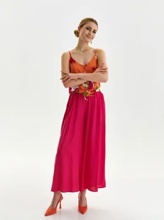 Bluzka damska Top Secret na cienkich ramiączkach. Pełna niecodziennego wdzięku bluzka damska bez rękawów na cienkich regulowanych ramiączkach, z dekoltem w kształcie litery V i częściowo odkrytymi plecami. Posiada ona pełen luzu oraz swobody styl i jest zapinana z przodu na ozdobne guziki, a u dołu pośrodku ma wiązanie z wykorzystaniem dłuższych części jej materiału. Została ona wykonana z delikatnej i przyjemnej w dotyku tkaniny wiskozowej, będąc wzbogaconą na całości efektownym nadrukiem w formie malowanych, dużych kwiatów. Bluzka dostępna w kolorze pomarańczowym DKE0009PO. Modelka ma 176 cm wzrostu i prezentuje rozmiar 34.