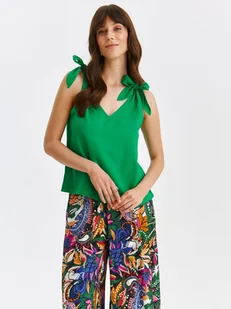 Ceniona za komfort oraz wygodę podczas użytkowania bluzka damska o luźnym kroju w wersji bez rękawów na efektownych ramiączkach z wiązaniem u góry z wykorzystaniem dłuższych części materiału. Posiada ona dekolt w serek i doskonale komponuje się zarówno w połączeniu z eleganckimi spodniami, jak i również ciekawą mini spódnicą. Została ona wykonana z przyjemnej w dotyku oraz dobrej jakościowo tkaniny wiskozowej, ujmując swą gładkością oraz trwałością. Bluzka dostępna w kolorze zielonym DKE0011ZI.