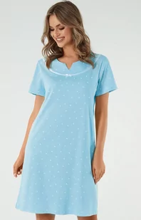 Koszula damska z krótkim rękawem turkusowa Elodia posiada klasyczny fason, który zapewnia dużą swobodę ruchów. Bawełniana koszula damska został urozmaicony fantazyjnym, okrągłym dekoltem z ciekawym wycięciem. Górną część wykończono atłasowym lampasem z dekoracyjną kokardką. Koszula posiada krótki rękaw, długość za kolano oraz nadruk w serduszka.