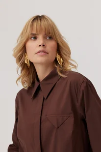 Koszula Henna z elastycznej popeliny w kolorze brązu to nowoczesna propozycja dla kobiet, które lubią połączenie klasyki z nutą minimalizmu. Prosta linia, klasyczny kołnierzyk i plisa z krytym zapięciem dodają jej miejskiego sznytu. Kieszonka z charakterystyczną trójkątną patką wyróżnia koszulę Henna na tle innych tego rodzaju koszul. Tworzy ona świetną, modową stylizację z szarą, wełnianą spódnicą Misty. prosty fason klasyczny kołnierzyk kieszonka z geometryczną patką na piersi kolor: