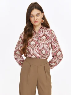 Koszula damska Top Secret z małym klasycznym kołnierzykiem. Ceniona za niebagatelny design oraz pełną subtelności elegancję koszula damska o luźnym kroju z małym klasycznym kołnierzykiem i zapięciem z przodu na guziki. Posiada ona długie proste rękawy zakończone wąskim mankietem z zapięciem na guzik, a niezwykłego uroku dodaje jej barwny nadruk na całości z motywami orientalnymi. Została ona uszyta z przyjemnej w dotyku oraz dobrej gatunkowo dzianiny, będąc odpowiednim uzupełnieniem zarówno eleganckiego stroju imprezowego, jak i również codziennego do pracy. Koszula damska dostępna w kolorze różowym TSKS25BLK356030X00.