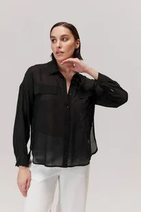 Najważniejsze cechy Szyta w Polsce z dbałością o precyzyjne wykończenia; Materiał: 100% wiskoza – lekka i przewiewna; Wzór i kolor: jednolita czerń o półtransparentnej strukturze; Fason: luźna koszula o klasycznym kroju z wydłużonym tyłem; Detale: kieszenie z patką na piersi, klasyczny kołnierzyk, listwa guzikowa, boczne rozcięcia, mankiety zapinane na guziki; Opis produktu Koszula Side to nowoczesne podejście do klasycznej czarnej koszuli – swobodna konstrukcja została przełamana lekkością półtransparentnej wiskozy; Luźny krój z przedłużonym tyłem i subtelnymi bocznymi rozcięciami tworzy płynną, opływową linię, idealnie wpisującą się w minimalistyczną estetykę.