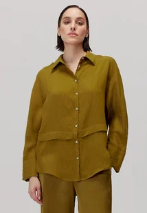Najważniejsze cechy: Materiał: strukturalna tkanina o lekkim połysku i subtelnej fakturze; Kolor: głęboki odcień oliwkowej zieleni – nasycony, a jednocześnie neutralny; Zapięcie na guziki w kolorze tkaniny, z klasycznym kołnierzykiem; Dekoracyjne patki na wysokości talii tworzące efekt podziału sylwetki; Wyraźne przeszycia modelujące sylwetkę, zapięcie na guziki; Opis produktu: Koszula Rina to wyważone połączenie elegancji, nowoczesnej formy i codziennej wygody. Wykonana z lekkiej, miękko układającej się tkaniny o subtelnie zarysowanej fakturze, prezentuje się niezwykle stylowo – zarówno w zestawach formalnych, jak i casualowych; Luźny krój z lekko wydłużonym tyłem świetnie układa się na sylwetce, nie opinając, a dekoracyjne patki w talii optycznie porządkują proporcje i dodają konstrukcyjnego charakteru; Skład: