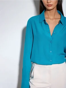 Turkusowa koszula z zapięciem na guziki i długimi rękawami.