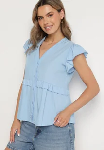Niebieska Koszula z Wiskozą z Falbankami i Dekoltem w Kształcie Litery V Alivienne